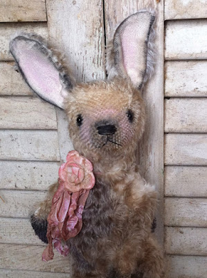Bun Bun is a new bunny pattern just for Spring. I just love the way she turned out. She looks like she just came out of the attic of an old home. She would be lovely with you other antiques and collectibles. Bun Bun measures 12", including her ears. She has curved arms and big rabbit feet. She is made from a European mohair, and she has German glass eyes. I have custom dyed and tinted the mohair. I added vintage ribbons, and a flower.